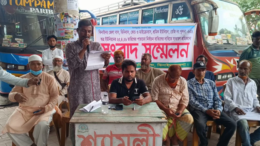ঝিনাইদহ জেলা বাস, মিনিবাস, কোচ ও মাইক্রোবাস শ্রমিক ইউনিয়নের নির্বাচন বাতিলের দাবী জানিয়েছে শ্রমিকদের একাংশ। বৃহস্পতিবার সকালে ঝিনাইদহ কেন্দ্রীয় বাস টার্মিনালে সাধারণ শ্রমিকদের ব্যানারে আয়োজিত সংবাদ সম্মেলনে এ দাবী করা হয়। সেসময় শ্রমিকরা অভিযোগ করেন, আগামী ২৫ এপ্রিল সংগঠনটির ত্রি-বার্ষিক নির্বাচন হওয়ার কথা রয়েছে। কিন্তু নির্বাচন হওয়ার আগে থেকে নানা